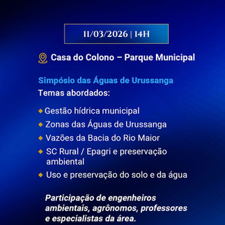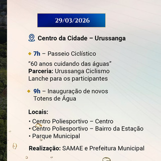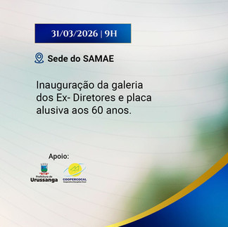 O Serviço Autônomo Municipal de Água e Esgoto de Urussanga (Samae) vai completar 60 anos de atuação no município e preparou uma programação especial ao longo do mês de março para celebrar a data. A abertura das comemorações acontece neste domingo, dia 1º, com missa às 18h30 na Igreja Matriz. Na sequência, haverá homenagens e confraternização no Salão Paroquial.