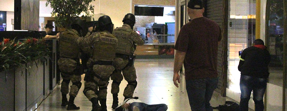 Figurantes, sangue falso e festim, fizeram parte do simulado de segurança realizado no Farol Shopping. O exercício preventivo que ocorreu na manhã desta terça-feira (25), foi realizado para reforçar as técnicas de segurança da equipe do shopping.